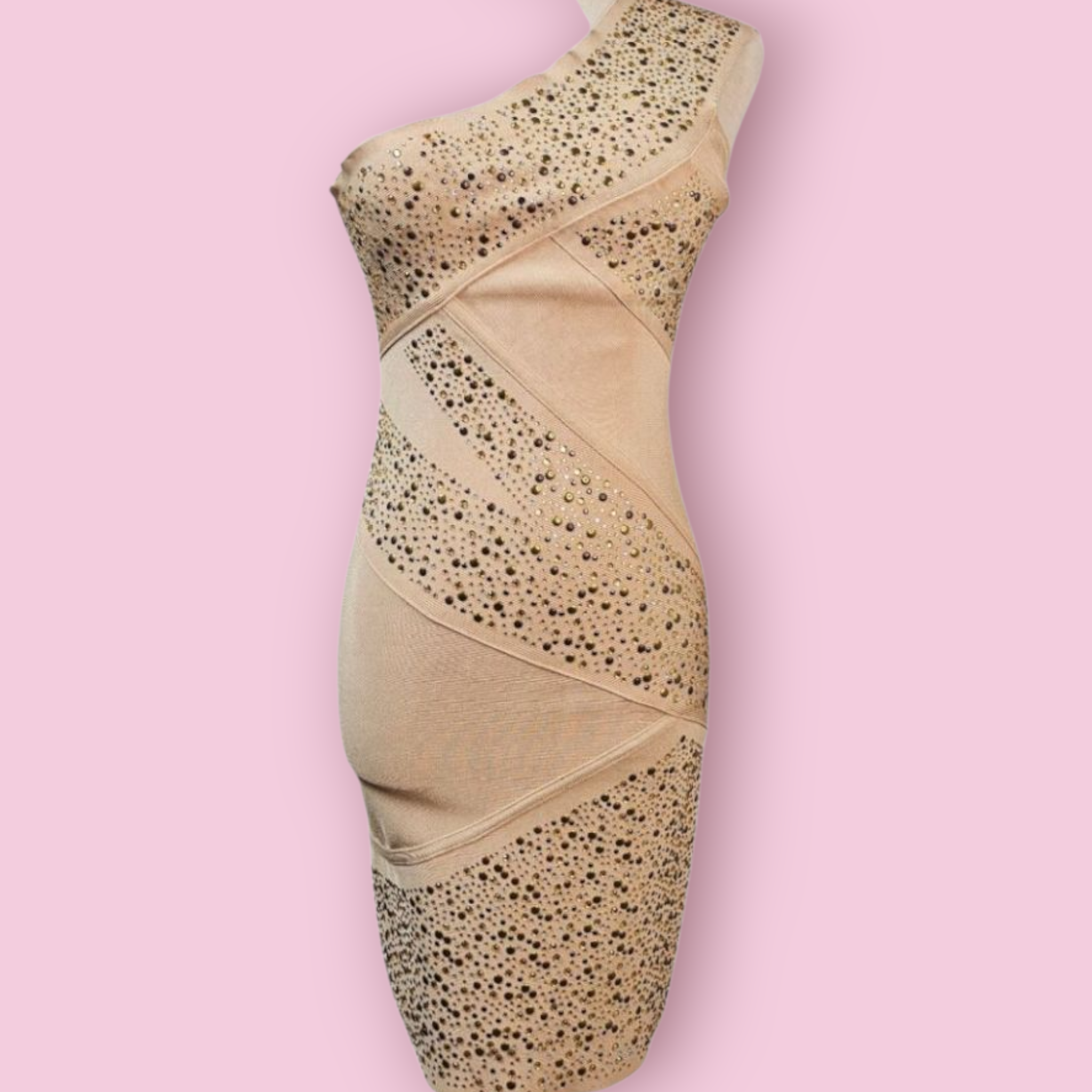 This Bronx & Banco one-shoulder bandage mini dress combines edgy sophistication with impeccable craftsmanship. Featuring hand-placed bronze, silver, gold, and chocolate embellishments, each detail is individually glued for lasting quality. The thick, stretch fabric sculpts your figure while allowing comfortable movement, hugging all the right places. Designed to be sexy and confident, this piece is an expertly crafted statement for any occasion.