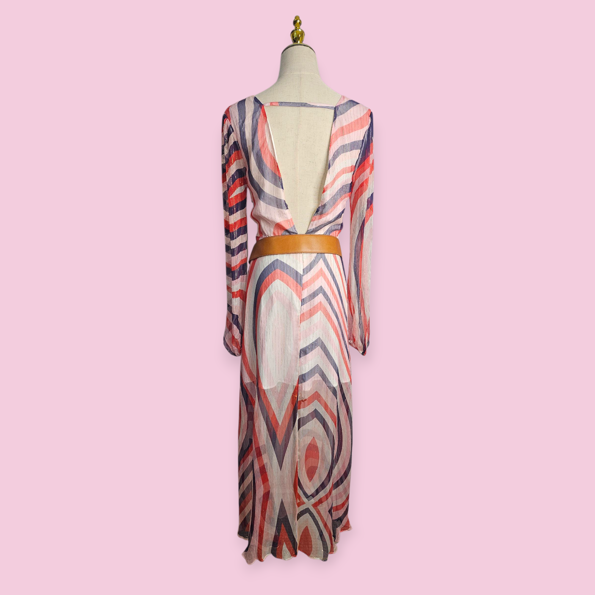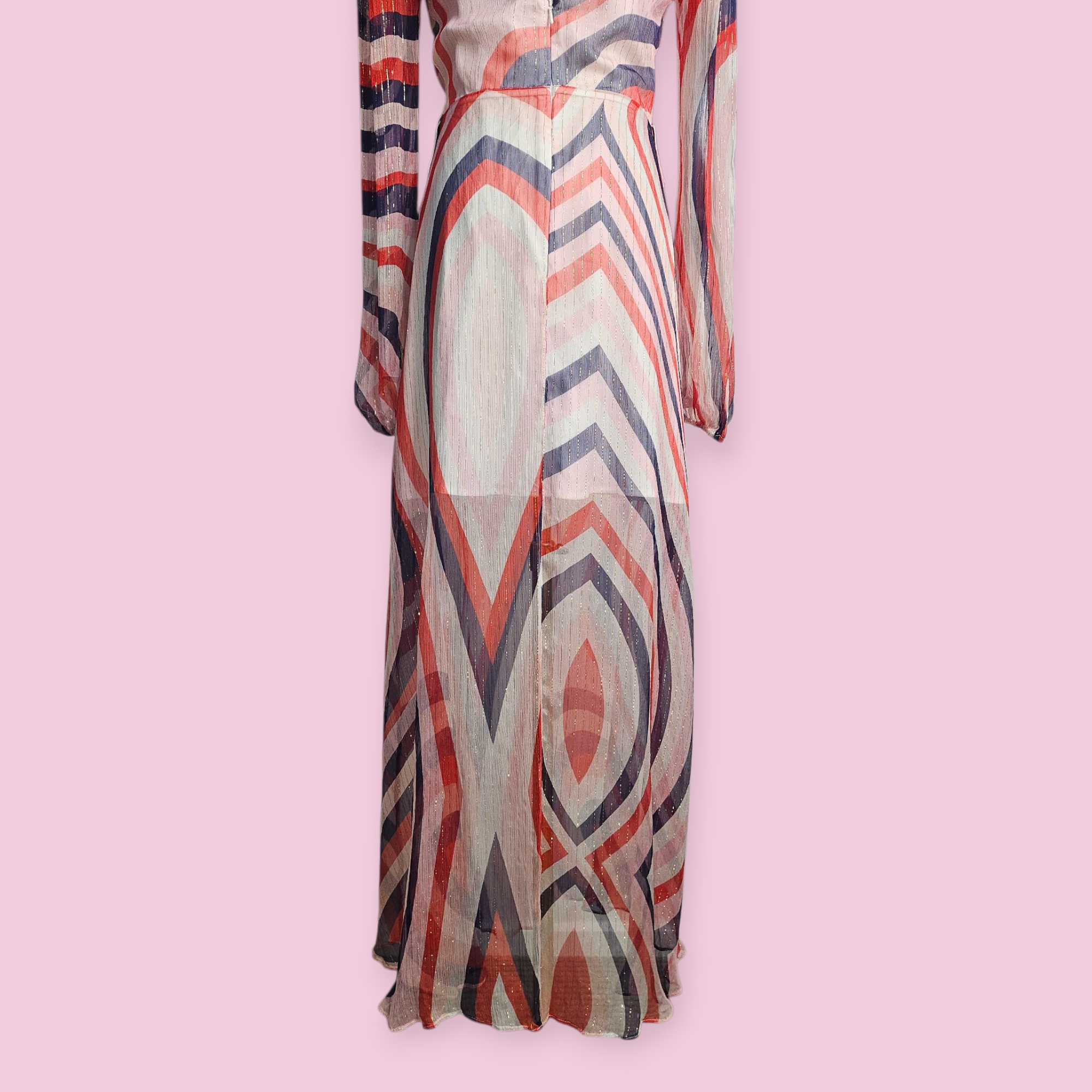 Embrace 70s glamour with the Talulah dress, featuring a bold vintage-inspired print enhanced by subtle silver metallic threads. Perfectly suited for races, cocktail parties, weddings, or resort wear, this dress captures the era's iconic style. Stunning colour pallet of dusty pink, light red & blue with a gold metallic thread running through. Pair it with a vintage belt, a stylish hat, or statement hoop earrings to complete your look with authentic retro flair.