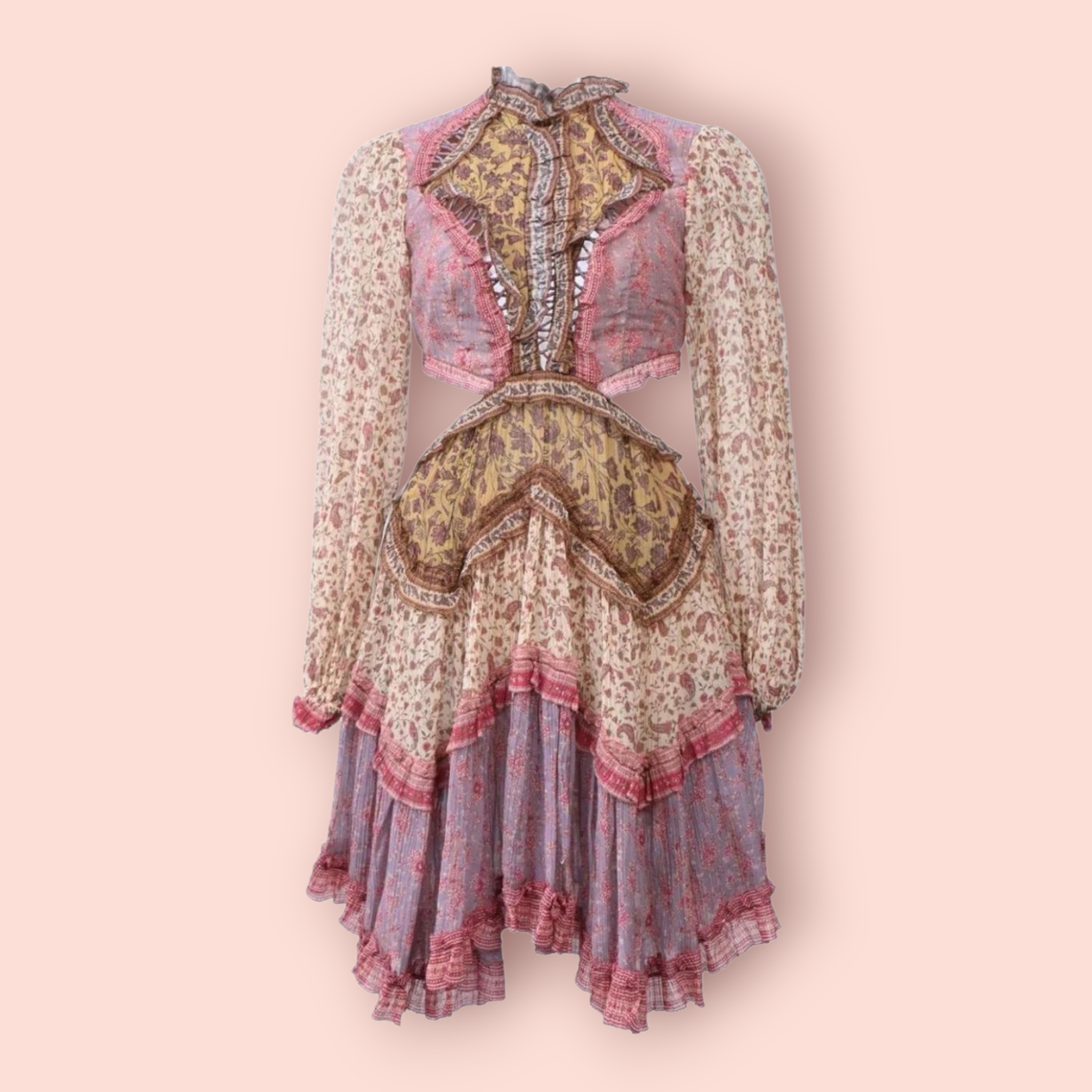 This Zimmermann 'Juniper Spliced' dress blends bohemian luxury with refined elegance. Featuring a delicate palette of soft pinks, browns, cream, and candy pink, the design highlights sweet ruffles, a high neckline, and an alluring cut-out back. Perfect for cooler seasons, its sophisticated charm pairs beautifully with vintage denim, creating a versatile and stylish statement piece for your wardrobe.