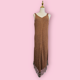 CHASING UNICORNS - CROTCHET BROWN DRESS WITH GOLD METALLIC THREAD & TURQUOISE FRINGE BEADING Est. Retail Price $340 BNWT