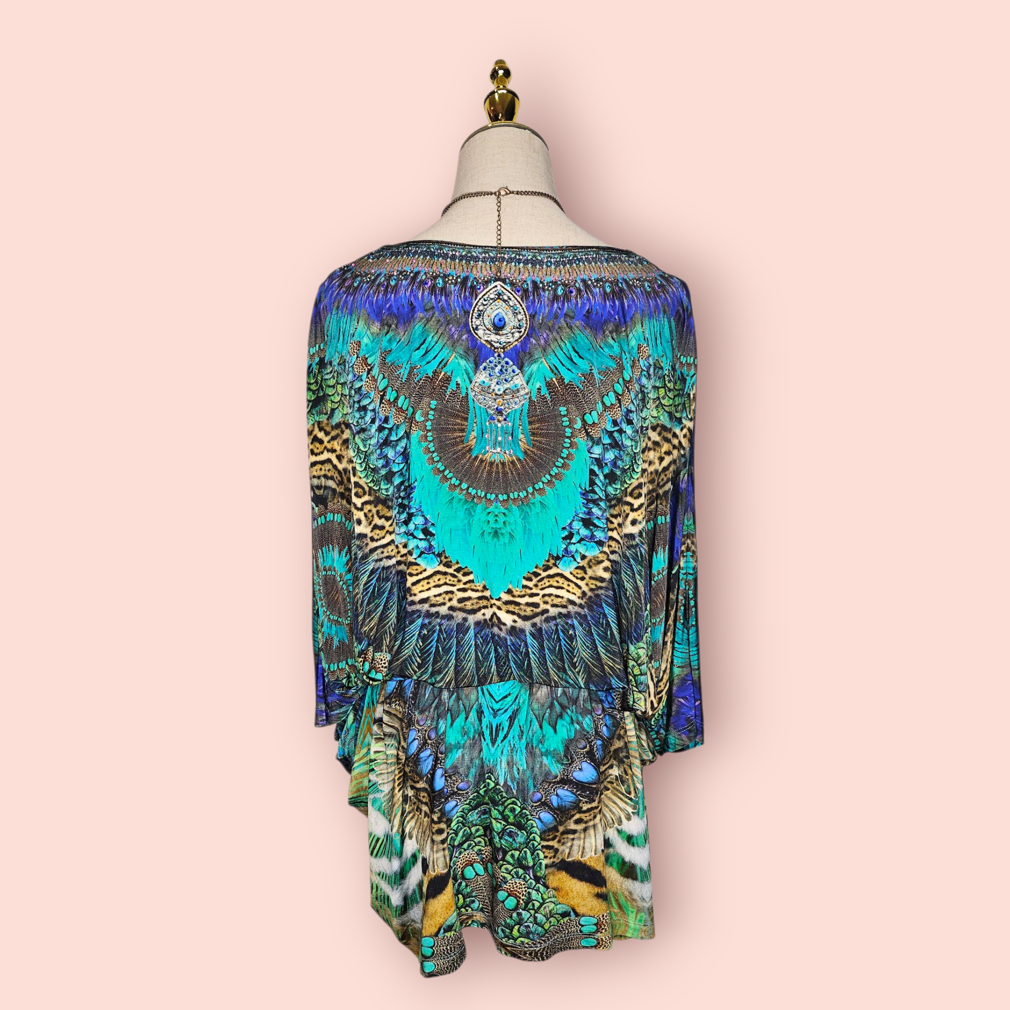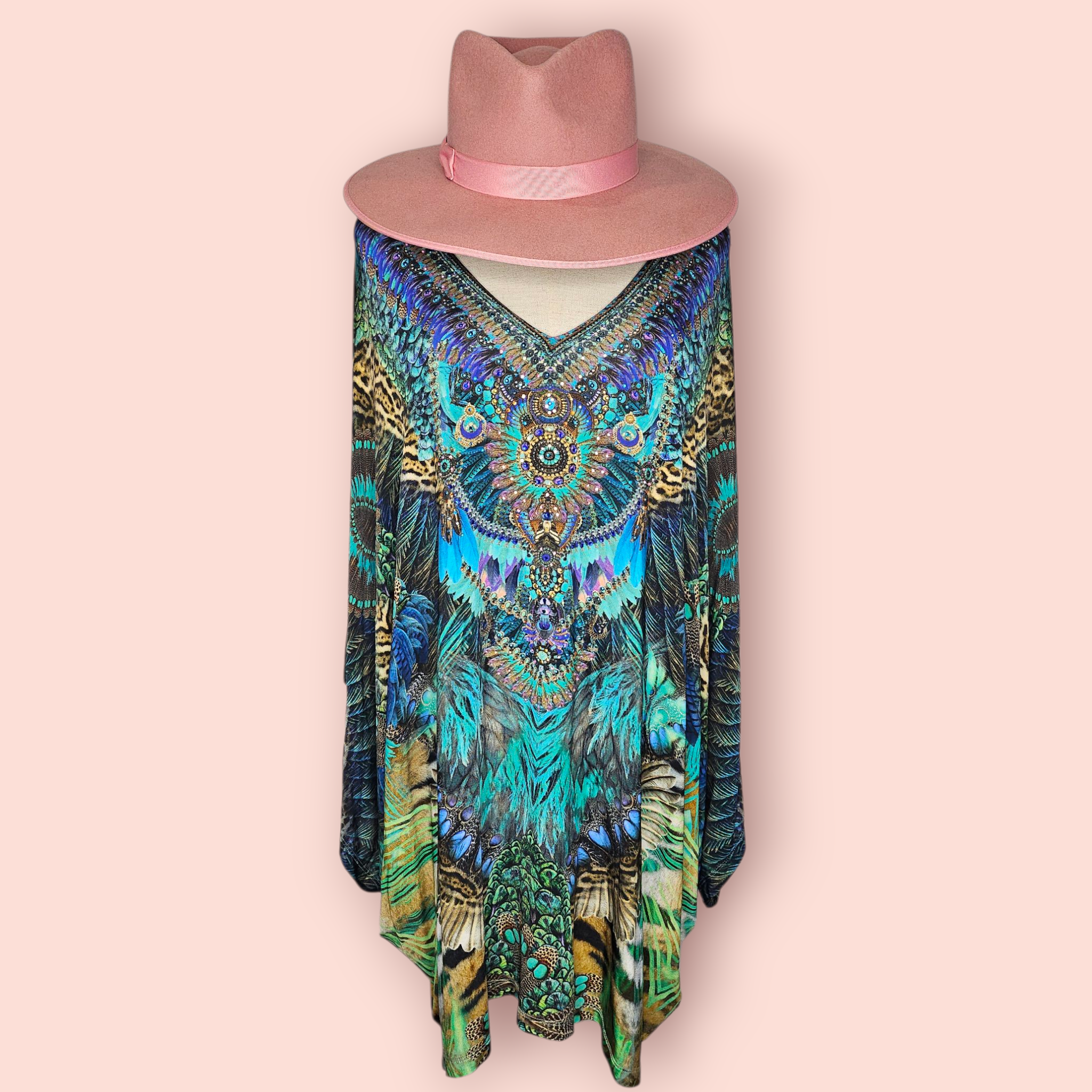 The Camilla 'The Creator' Bat Sleeve Mini Dress features an exclusive hand-painted print inspired by the vibrant native peacocks of India. Its free flowing, relaxed fit silhouette offers comfort and elegance, making it ideal for spring and summer events. This versatile dress transitions effortlessly from cocktail parties to poolside lounging or festival days, combining artistic detail with wearability for a sophisticated, season-ready look.