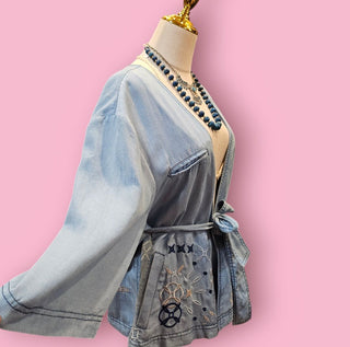 VINTAGE - 80'S DENIM ACID WASH EMBELLISHED CROPPED DENIM JACKET
