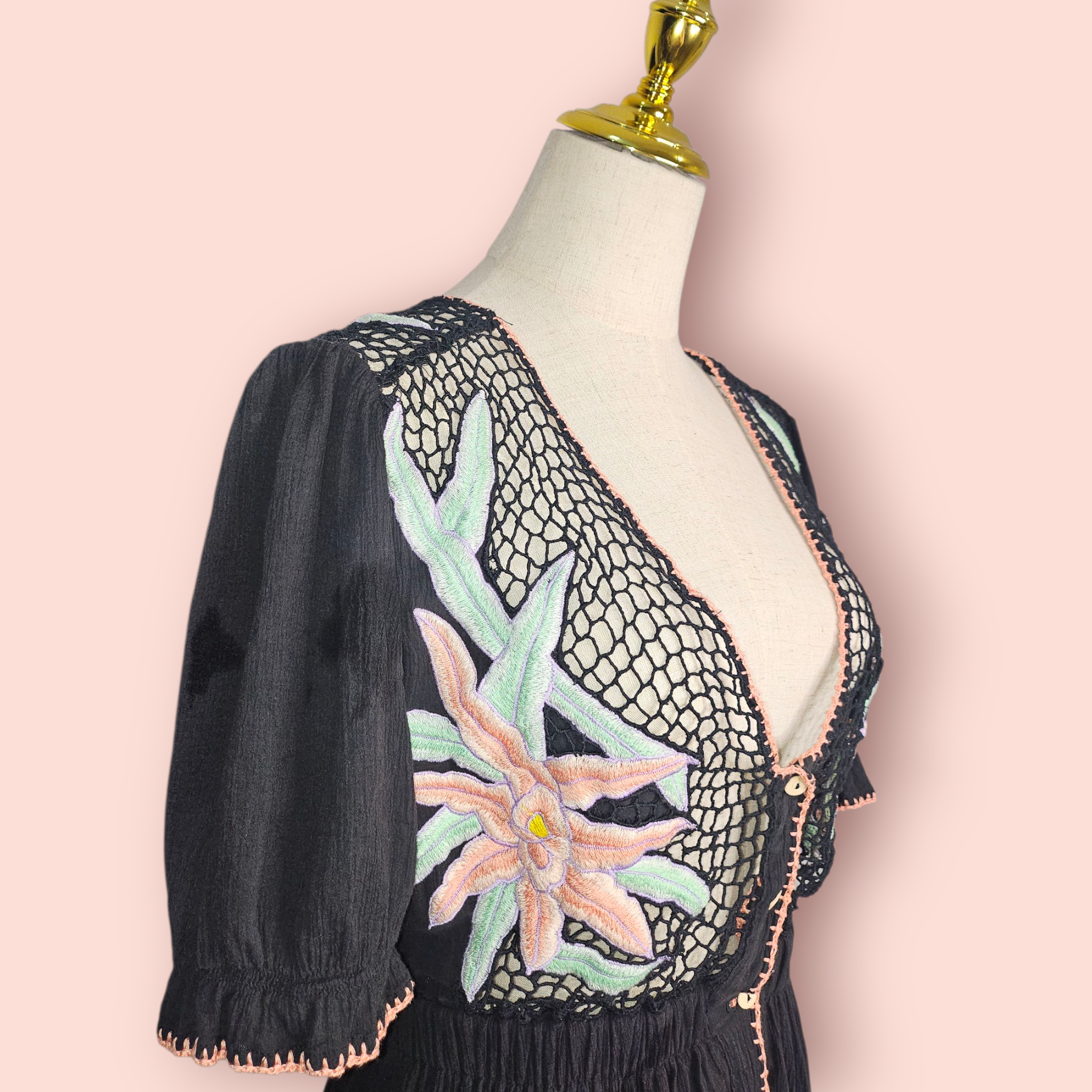 Embrace effortless 70s-inspired style with the Chasing Unicorns handmade cotton mini dress. Lightweight and handsewn with intricate embroidery designs and beautiful crotchet trimming details throughout. This piece pairs perfectly over swimmers for beach days or styled with your favorite belt and ankle boots for festival vibes. Dress it up with heels for a night on the town, blending vintage charm with modern versatility.