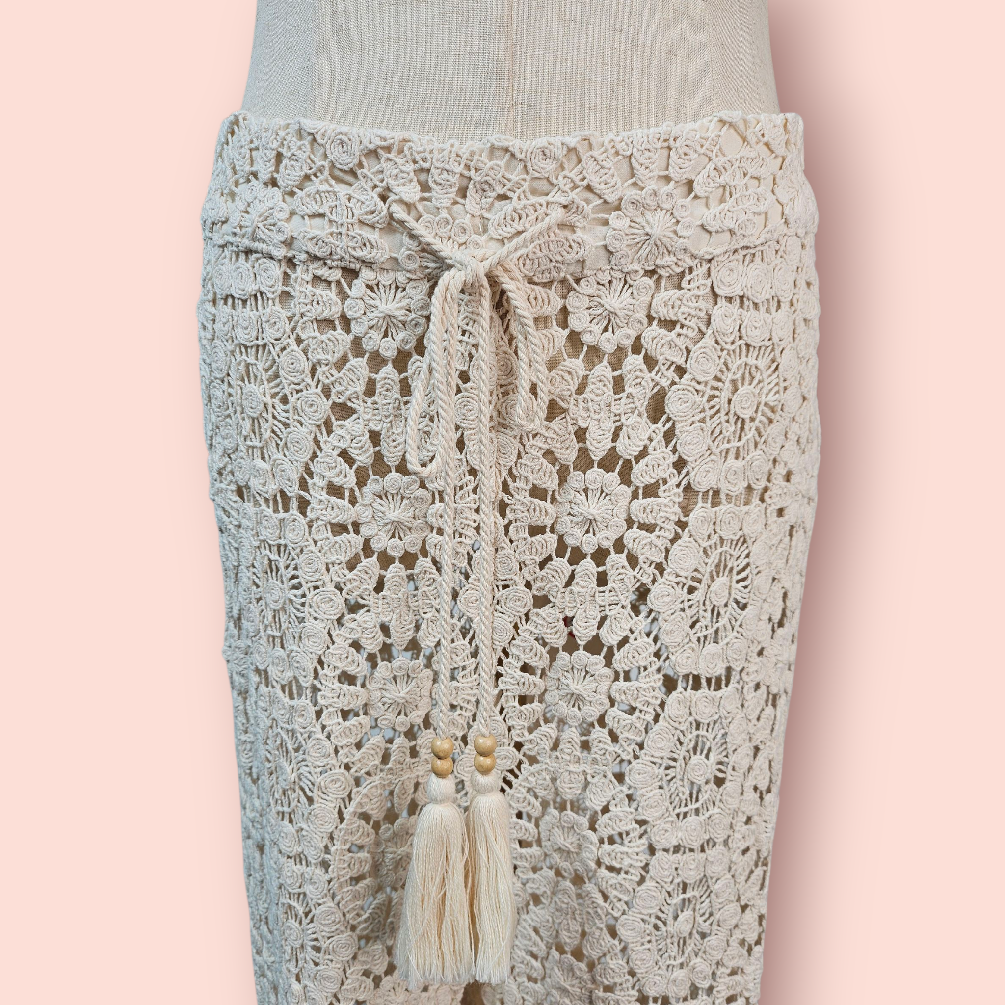 - Waist adorned with drawstring tassels & wooden beads