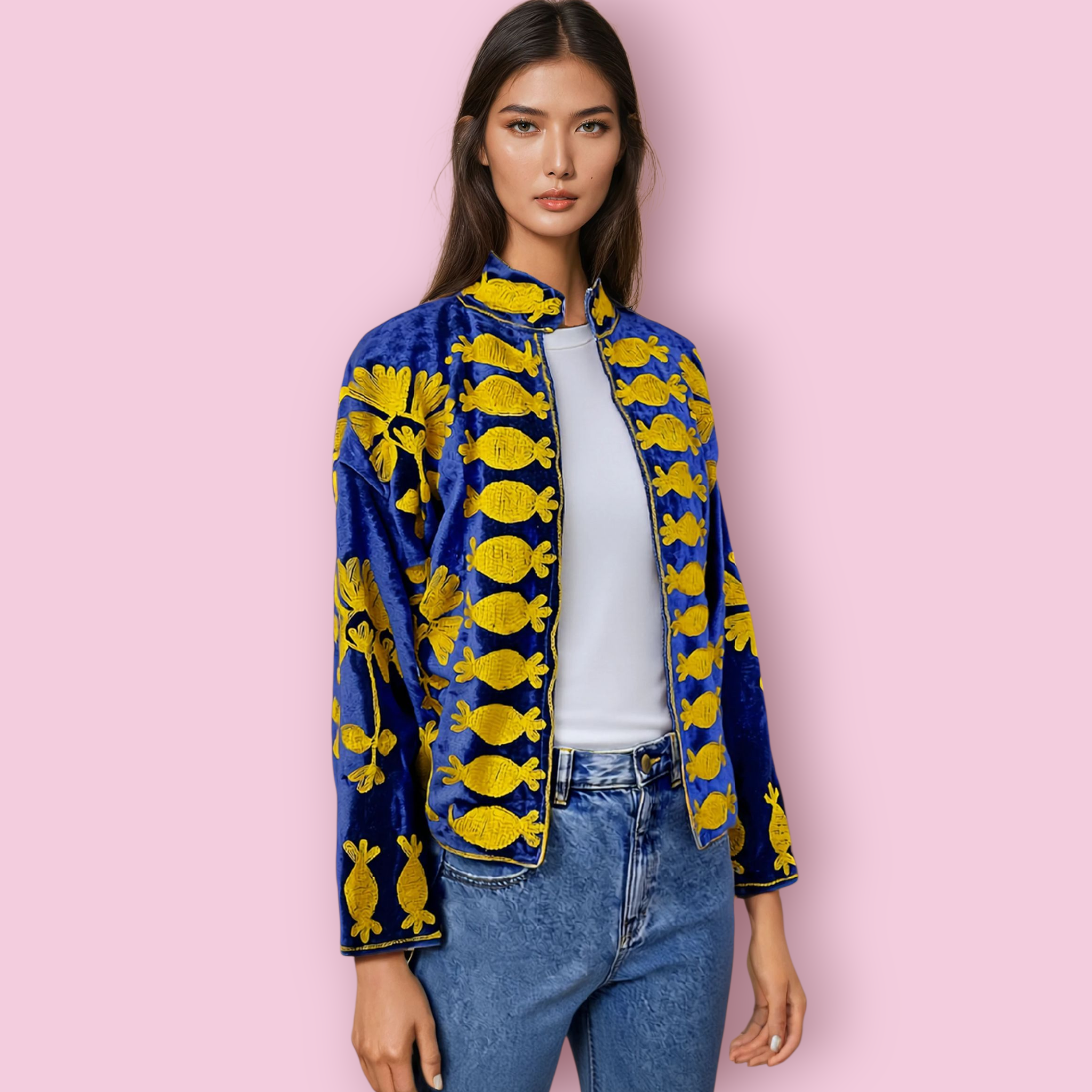 This lightweight navy-blue velvet jacket blends bohemian charm with refined craftsmanship, featuring delicate tan flower handsewn embroidery. Its open style offers effortless layering, making it a versatile statement piece that complements any wardrobe. Ideal for transitional seasons, it merges comfort with distinctive style suitable for various occasions. Casual look in fit & size.