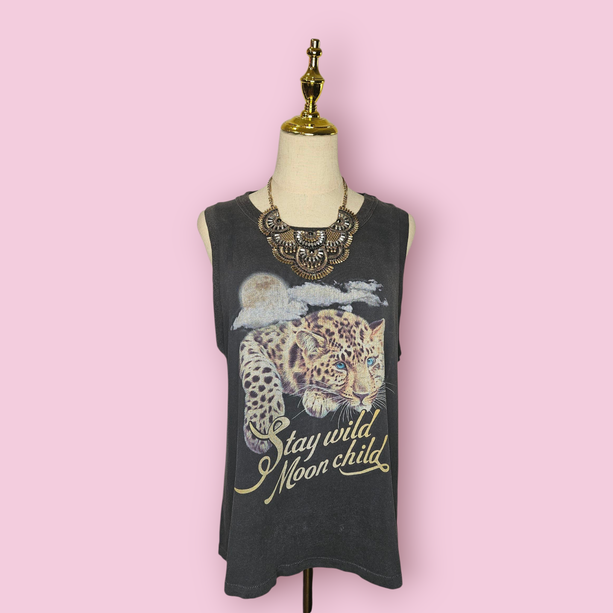The SPELL & THE GYPSY 'Stay Wild Moon Child' Tank delivers classic rocker style with a timeless cut and lightweight fabric. Its iconic design complements vintage denim shorts and a leather belt perfectly, creating an effortless, authentic look that balances comfort with edgy, vintage-inspired flair. Ideal for those who value quality and enduring style in their casual wardrobe.