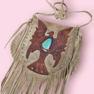 BUFFALO GIRL - VINTAGE PHEONIX LEATHER TOOLED SUEDE FRINGE HANDBAG RRP $850
