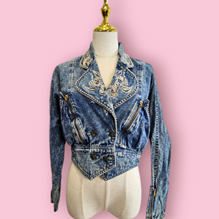 VINTAGE - 80'S DENIM ACID WASH EMBELLISHED CROPPED DENIM JACKET