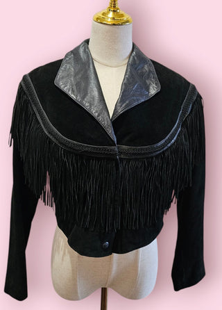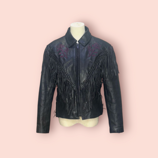 VINTAGE - HUDSON BLACK LEATHER FRINGED JACKET WITH FLOWER DETAIL CUTOUTS US IMPORT